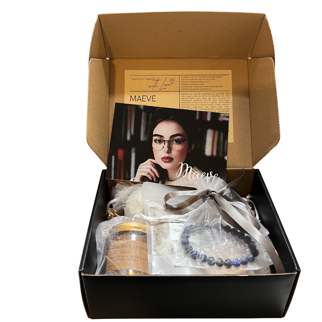 The Maeve gift box is the perfect escape for the brilliant woman whose mind is always solving puzzles and dreaming up ideas. This box includes a striking Lapis Lazuli bracelet, prized over centuries for its deep blue metamorphic stone symbolizing mystery, wisdom, and a deep understanding of oneself and the universe, and six high-quality artisan self-care items: eucalyptus & mint scented handmade candle, blossom euphoria natural bath bomb, lavender chamomile bath soak, lavender handmade soap, sandalwood vanilla scented handmade lotion bar, and lavender eucalyptus essential oil. Perfectly curated for a deep relaxing and grounding experience to calm the mind and refresh the spirit. ❤︎